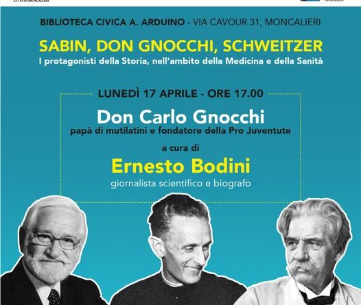 Lunedì 17 Aprile alle ore 17.00 – presso la Biblioteca civica Arduino, via Cavour 31, Moncalieri (TO) si terrà una conferenza su Don Carlo Gnocchi: papà dei mutilatini e fondatore della Pro Juventute. Questo sarà il secondo incontro del 𝗖𝗶𝗰𝗹𝗼 𝗱𝗶 𝗰𝗼𝗻𝗳𝗲𝗿𝗲𝗻𝘇𝗲 𝘀𝘂𝗶 𝗽𝗲𝗿𝘀𝗼𝗻𝗮𝗴𝗴𝗶 𝗱𝗲𝗹𝗹𝗮 𝗦𝘁𝗼𝗿𝗶𝗮 𝗱𝗲𝗹𝗹𝗮 𝗠𝗲𝗱𝗶𝗰𝗶𝗻𝗮 a cura di 𝗘𝗿𝗻𝗲𝘀𝘁𝗼 𝗕𝗼𝗱𝗶𝗻𝗶.