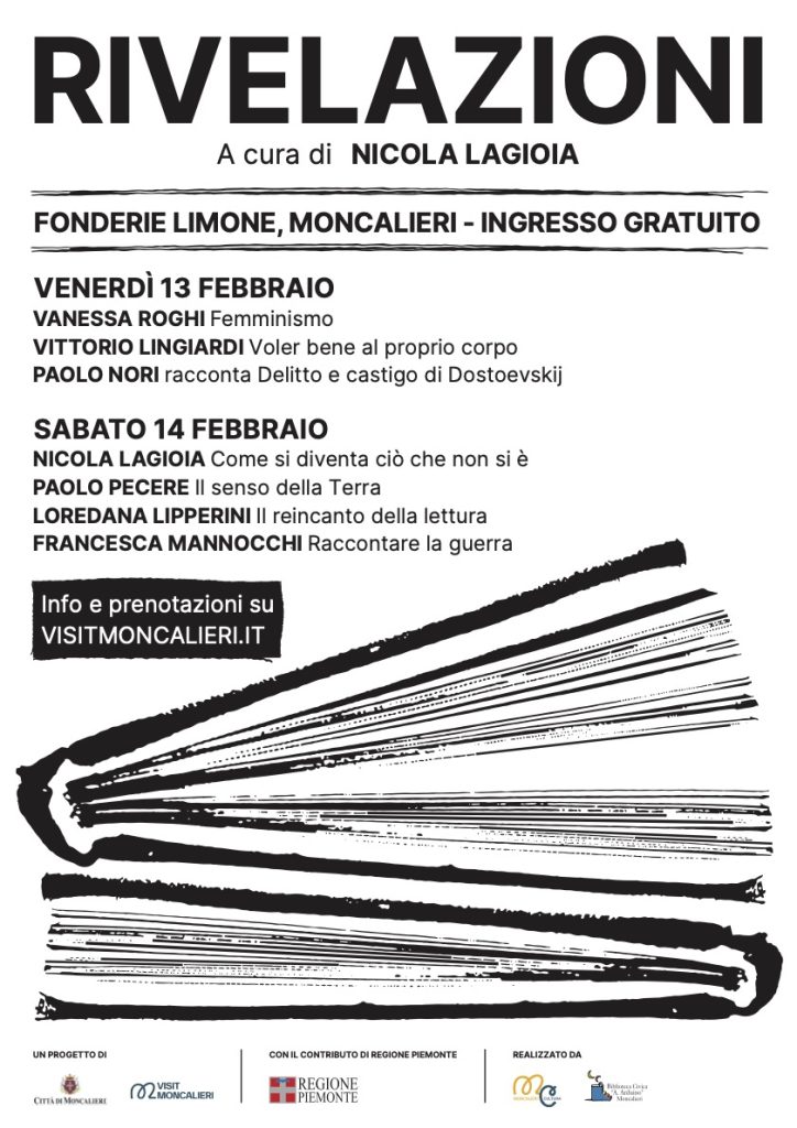 All’interno di Moncalieri Legge prende vita Rivelazioni, rassegna diretta dallo scrittore Nicola Lagioia, che alle Fonderie Limone propone un ciclo di incontri, lezioni e momenti di approfondimento con alcune delle voci più autorevoli del panorama culturale italiano.